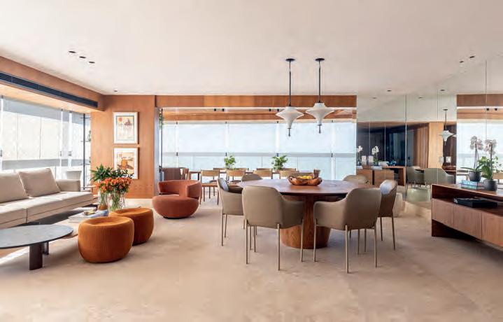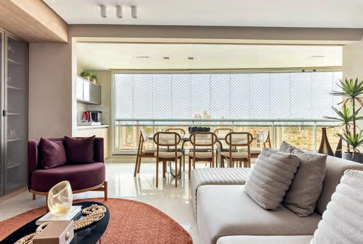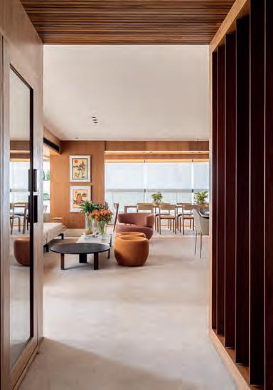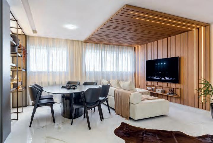 Ideias do projeto. Com uma cartela de cores concisa e elementos visuais que criam uma identidade única ao projeto, a arquiteta Danielle Valente Lopes superou as expectativas do casal, com dois filhos adultos, que buscava mais conforto, leveza, amplitude e espaços com funções bem definidas em seu novo apartamento. A sala abriga estar e home theater, totalmente integrada à varanda com bancada de apoio, de um lado, e sala de jantar, do outro, criando um fluxo inteligente especialmente para os dias de receber convidados. Um escritório completo e um open bar aconchegante foram outros pedidos prontamente atendidos, que também personalizam o projeto. Ripados de madeira surgem em pontos estratégicos como elemento-chave, seja no painel da sala de jantar, em detalhes na cozinha ou mesmo no escritório e na sala de jogos. Tudo pensado em detalhes para se alinhar ao lifestyle da família. Detalhes marcantes. O projeto de iluminação valoriza os efeitos indiretos e vem aliado ao mobiliário. O quartzito Azzuli no painel do home theater também rouba a cena. A suíte do filho é descolada e aconchegante, com uma estante vazada que permite expressar gostos pessoais e mudar sempre que desejar. No quarto da filha, destaque para o painel vazado que delimita o closet de forma sutil.