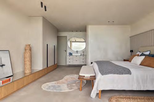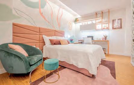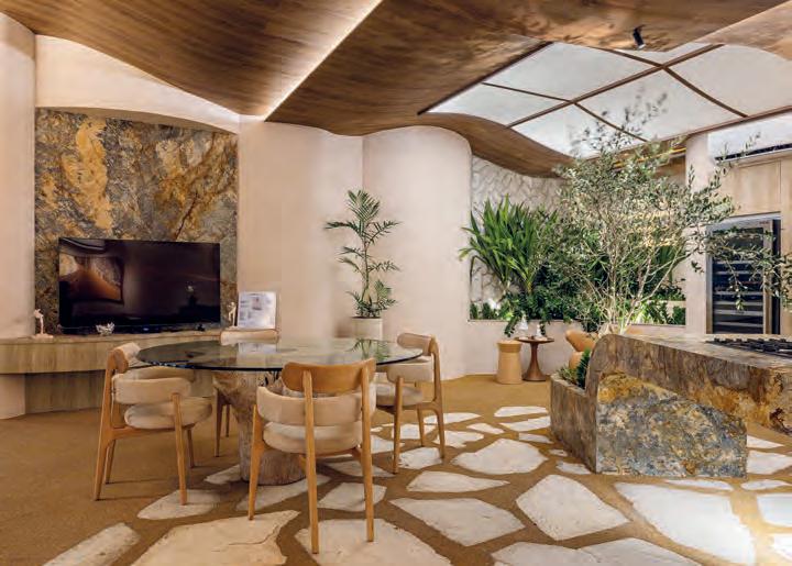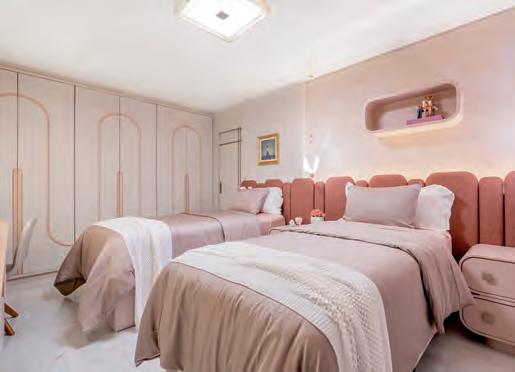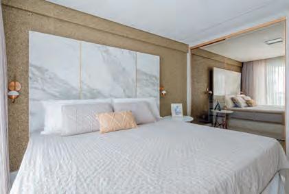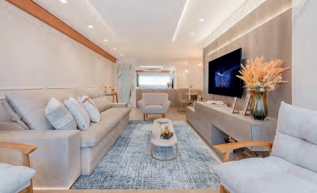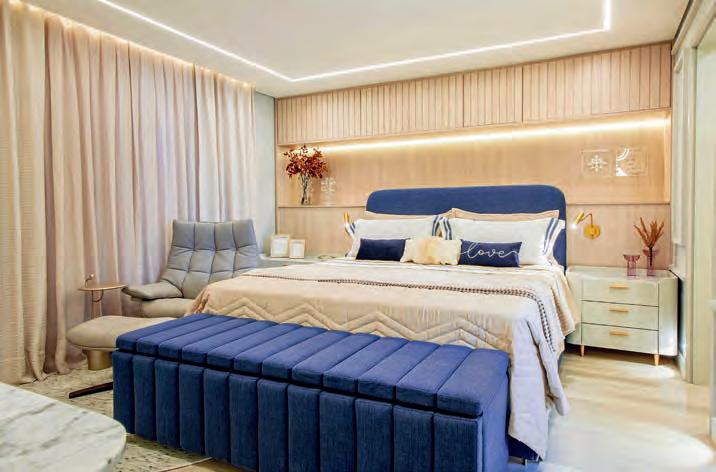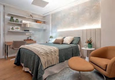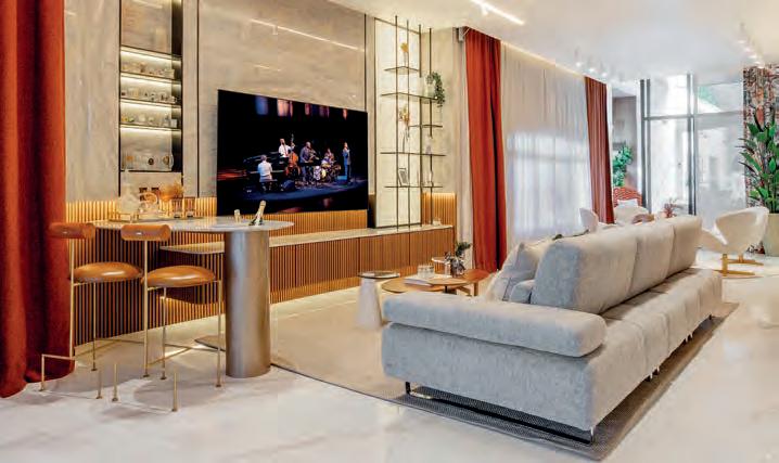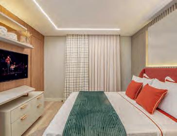 Detalhes marcantes. Na sala, o painel ripado, que oculta as portas de acesso, mostra a harmonia entre funcionalidade e estética. O MDF em padronagem corten aquece o ambiente e traz uma elegância contemporânea. Menção especial para o quarto do casal, com painel ripado, acolchoado em couro, detalhes em dourado e um closet que remete às maisons europeias, com portas em espelho fumê e iluminação indireta, criando um ambiente luxuoso e funcional. O rooftop finaliza a experiência com uma área de lazer cercada pela paisagem, ideal para momentos de relaxamento e convívio familiar.