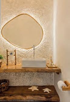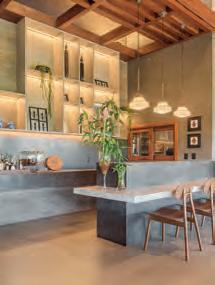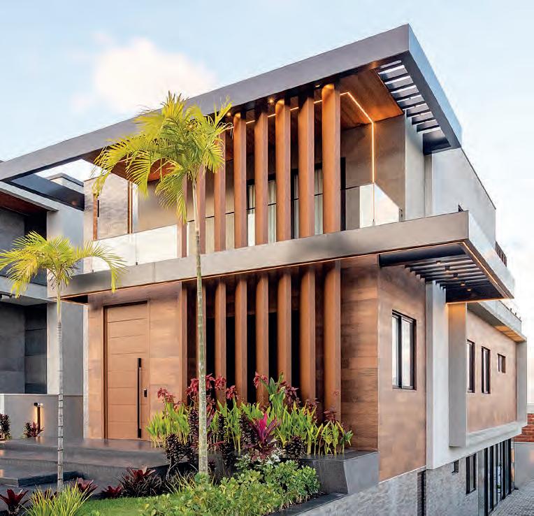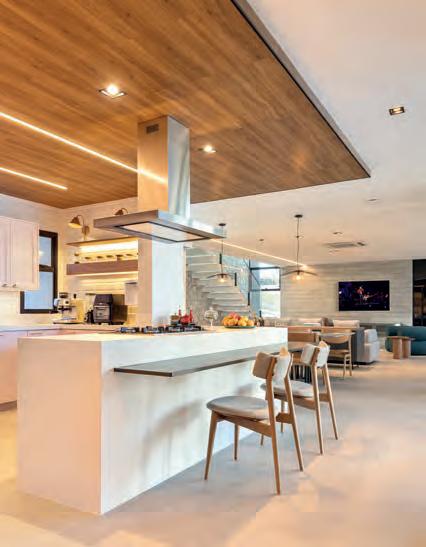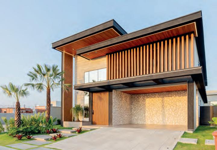 Ideias do projeto. Esta residência, assinada por Mayrla Souto Maior, traz uma essência rústica sofisticada, com foco no conforto e na longevidade, proporcionando um ambiente acolhedor que poderá ser apreciado por gerações. A solução inovadora para o terreno íngreme, com um único pavimento sobre a garagem, destaca a inteligência do design, aproveitando ao máximo o terreno sem comprometer a acessibilidade e a fluidez dos espaços. A inclinação do teto é um dos grandes diferenciais do projeto, que além de proporcionar leveza à estrutura, maximiza a entrada de luz natural, destacando os pontos de contemplação pensados para os moradores. A arquitetura, de linhas simples e materiais naturais, valoriza a beleza da madeira e das rochas ornamentais, criando uma conexão direta com a natureza. Um bom exempo é o padrão madeirado em Cumarú, utilizado no lambri e nas esquadrias, que traz uma rusticidade sofisticada à composição. Detalhes marcantes. Destaque para o charmoso painel em muxarabi, utilizado para o fechamento da escada que leva à garagem, proporcionando uma privacidade sutil, e para o ladrilho hidráulico na cozinha – com um design exclusivo e um resgate da memória afetiva, agregando valor sentimental e enriquecendo ainda mais o ambiente.