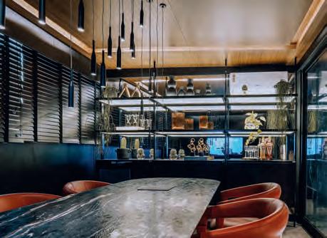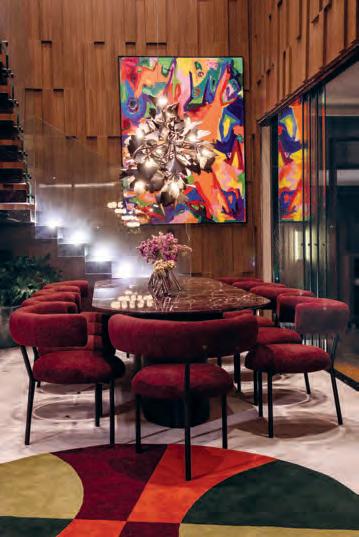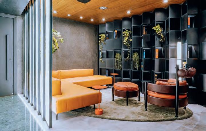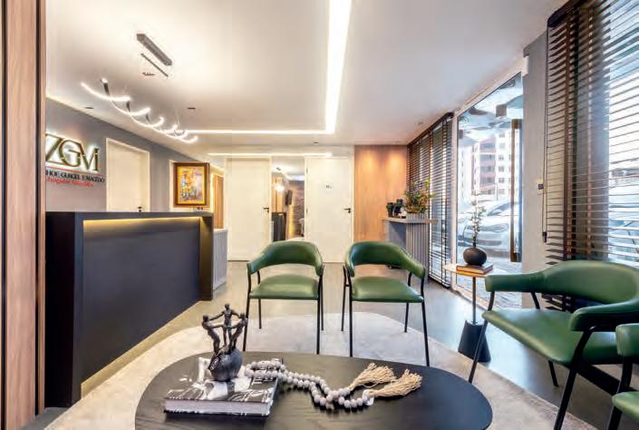 Ideias do projeto. O projeto do escritório de advocacia elaborado pelo arquiteto Matheus Bulhões foge do lugar comum pela ousadia das cores e pela mescla de elementos clássicos e contemporâneos. A escolha do mármore verde Guatemala, em contraste com as cadeiras vermelhas, simboliza com elegância o ambiente jurídico, sendo uma combinação arrojada que, aliada a estante em movimento geométrico e os pendentes irregulares, refletem a personalidade única da composição. O uso de materiais como couro caramelo, a madeira escura, que reveste paredes e teto, junto ao mobiliário planejado com acabamentos refinados e à iluminação indireta, cria um jogo de luz que reforça a sensação de aconchego, enquanto a inclusão de grandes nomes do design brasileiro, como Sérgio Rodrigues e Jader Almeida, adiciona atemporalidade e exclusividade ao espaço. O resultado é um projeto de identidade visual marcante que transmite seriedade e sofisticação, ao mesmo tempo que proporciona um ambiente acolhedor e confortável para os clientes. Detalhes marcantes. O conceito de “caixinha de joias” para as estantes iluminadas nas salas é um elemento criativo que agrega valor ao projeto, destacando de forma sutil os adornos e dando uma sensação de preciosidade ao espaço. Destaque também para o movimento geométrico da estante, o teto madeirado e os brises que delimitam a recepção, transmitindo intimismo e elegância.