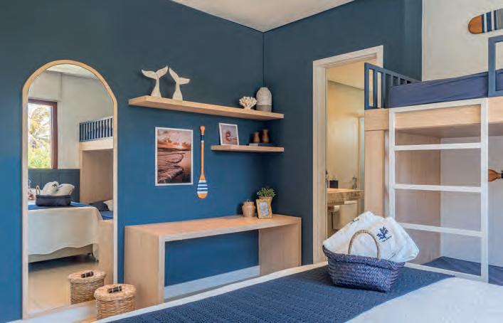 Ideias do projeto. Esse apartamento de praia, assinado por Daniela Benicio e Juliana Benicio, ganhou uma atmosfera urbana, sem abrir mão da beleza de elementos como corais, areia e o mar, que remetem à serenidade do ambiente marinho. Um exemplo são as formas orgânicas dos corais, que inspiraram o design de interiores, trazendo uma sensação de movimento fluido, enquanto os materiais naturais, como madeira clara, o linho das cortinas e detalhes em palha, adicionam aconchego, leveza e bem-estar. “A paleta de cores transita entre tons neutros de areia, cinza e bege, combinados com azuis suaves que evocam o mar e o céu. Pontos de cor em turquesa acrescentam um toque vibrante, representando a vida marinha e a luz natural da costa”, explica a dupla. O resultado é um refúgio moderno e elegante, que captura a essência litorânea para promover um estilo de vida relaxante. Detalhes marcantes. Grandes vãos maximizam a entrada de luz e permitem uma vista direta do oceano, criando uma integração entre o interior do apartamento e o horizonte marítimo.