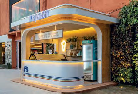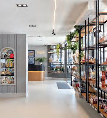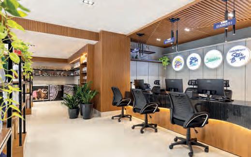 Ideias do projeto. A reforma do prédio da Ster Bom modernizou e revitalizou o prédio original da fábrica, com mudanças importantes na fachada frontal e lateral. O projeto de Dalliane Queiroz integrou uma nova área ao edifício existente, criando uma fachada única com o uso de materiais como ACM e brises, que atualizaram o visual do empreendimento e ofereceram proteção solar. A sorveteria foi realocada e ampliada, com destaque para o pé-direito alto, onde vigas de madeira foram incorporadas como elemento central. A arquiteta além de manter os tons de cinza e azul já utilizados, seguiu o estilo moderno e minimalista, com mobília em linhas retas, mantendo uma identidade visual coesa, em sintonia com o padrão adotado em outras lojas da marca. A ambientação baseada em uma paleta de cores neutras incorporou o aconchego das texturas naturais, sobretudo os padrões madeirados, mármores e o uso de pedras naturais, trazendo aconchego e aliar funcionalidade à proposta.