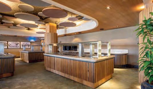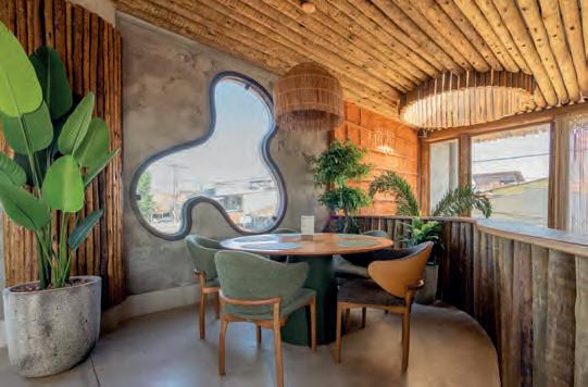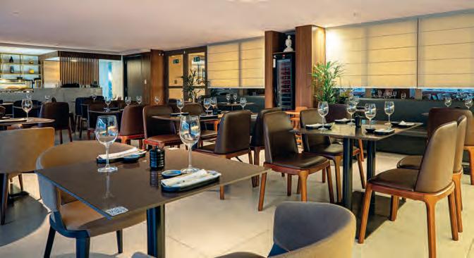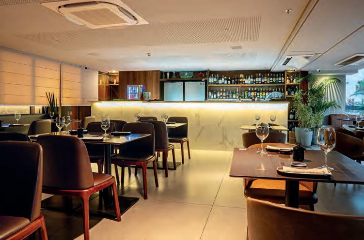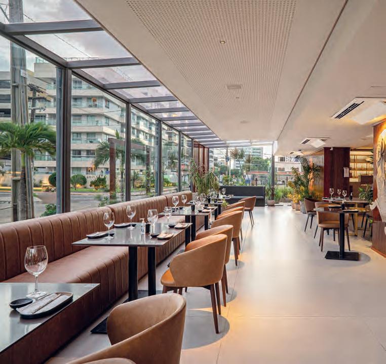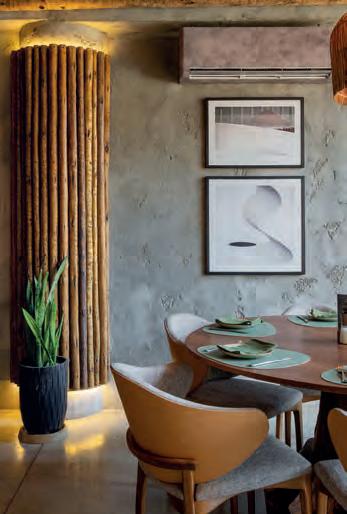 Ideias do projeto. O Mitt Sushi Bar, localizado no Oceana Atlântico Hotel, em João Pessoa, é um espaço que combina a tradição da gastronomia japonesa com um design contemporâneo e acolhedor, oferecendo aos clientes uma experiência imersiva. O projeto, assinado pela arquiteta Lorenna Sales, traz uma fachada ampla com uma sacada e grandes painéis de vidro com vista para o mar, que, além de estabelecer uma conexão visual envolvente entre o interior e o exterior, cria um ambiente que convida à contemplação tanto da vista costeira quanto do design interno. O décor apresenta uma fusão entre o minimalismo japonês e a paisagem tropical do litoral paraibano. Esse equilíbrio foi alcançado por meio da escolha criteriosa de materiais naturais e da paleta de cores, que privilegia tons neutros e terrosos, em harmonia com as nuance da orla marítima. O layout aberto favorece a sensação de fluidez e conforto, enquanto a iluminação suave contribui para atmosfera intimista do restaurante. Detalhes marcantes. Um dos destaques do Mitt Sushi Bar é a peça de arte em relevo, estrategicamente posicionada para se tornar o ponto focal do restaurante. A escultura, que retrata uma gueixa, foi cuidadosamente projetada por Wilson Figueiredo e fixada em uma parede revestida de madeira. Esse detalhe remete à tradição japonesa, acrescentando um toque artístico e cultural ao espaço.