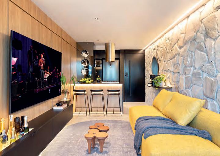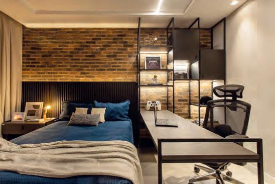 Ideias do projeto. A arquiteta Rita Braga focou na convivência no projeto deste apê, criando múltiplos ambientes sociais integrados visualmente, mas delimitados por meio de soluções inteligente de texturas, cores e materiais. Assim, estar, jantar, sala de TV e home office convivem em total harmonia, mas com identidades únicas. A entrada é demarcada pelo azul profundo, que contorna parede e teto, fazendo um impactante contraponto a textura com fragmentos de rochas naturais, que é o plano de fundo do estar. O mobiliário contemporâneo explora toques pontuais de cor para quebrar visualmente a paleta neutra predominante na base, enquanto o madeirado claro de painéis reforça a atmosfera aconchegante e sofisticada dos ambientes. Na área íntima, a personalização predomina, trazendo uma linguagem moderna que valoriza tons amadeiros e terrosos na suíte principal. O quarto do filho, por sua vez, assume uma atmosfera industrial, com tijolinho aparente, linhas retas, cores sóbrias e a expressividade da serralheria. Detalhes marcantes. A diversidade de acabamentos é o elemento principal na segmentação do living integrado. Para demarcar a sala de TV do home office, uma porta de correr semitranslúcida assegura privacidade quando necessário, sem pesar na ambientação.