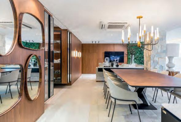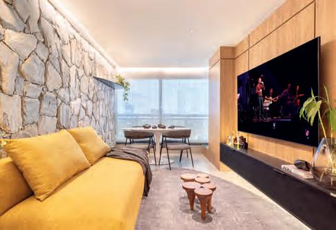 Ideias do projeto. O projeto de reforma do apartamento, conduzido por Sarah Cavalcanti, atendeu ao desejo dos clientes de criar uma atmosfera caseira e acolhedora, transformando a residência em um refúgio confortável e elegante. A estratégia da arquiteta foi explorar as texturas naturais, com um cuidadoso equilíbrio entre aconchego e sofisticação, visível na combinação de generosos painéis de madeira e revestimento em pedra bruta na área social integrada. Esse espaço se destaca por sua composição eclética, que harmoniza elementos modernos e elegantes, como o lustre sobre a mesa de jantar, a composição de espelhos orgânicos e o mobiliário contemporâneo, sem se limitar a um estilo específico. Além disso, a inclusão de biofilia, na forma de um jardim vertical junto ao painel da TV, traz a natureza para dentro do apartamento e cria uma atmosfera relaxante. Detalhes marcantes. O uso da pedra bruta em paginação irregular é um ponto de destaque. Ela não apenas oferece personalidade única às paredes, mas também funciona como uma camuflagem inteligente para os pilares, que passam a ser elementos esculturais no espaço. Na cozinha, os armários retroiluminados em vidro reflecta funcionam como vitrines sofisticadas para o acervo de louças e cristais, evidenciando um toque luxuoso que completa a ambientação.