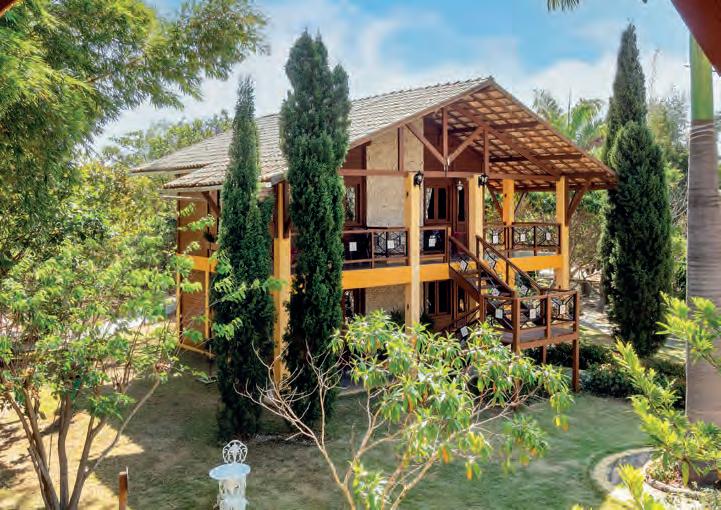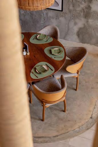 Ideias do projeto. A pousada projetada pela arquiteta Liana Suassuna foi concebida com o conceito claro de criar um espaço acolhedor, integrado à flora local e que evocasse memórias afetivas nos visitantes. Um dos pilares do projeto foi a combinação de técnicas construtivas tradicionais de alvenaria com o uso da madeira, criando uma estrutura que reflete uma harmonia entre arquitetura e natureza. A proposta oferece uma atmosfera rústica e agradável, atendendo a um programa extenso que inclui 20 apartamentos, um spa com massagem e ofurô, uma praça do vinho, um restaurante e áreas administrativas. A escolha dos materiais foi criteriosa, resultando em uma ambientação repleta de personalidade. Um exemplo disso é o uso de piso cimentado, mosaicos artesanais e revestimentos em pedra bruta reforça a conexão com o clima serrano, criando um diálogo perfeito entre a arquitetura e o entorno natural. Detalhes marcantes. Outro aspecto marcante do projeto é a valorização do artesanato local. O handmade ocupa um lugar de destaque, com telas, esculturas, peças de crochê e outros adornos que celebram o talento dos artistas e artesãos nacionais, conferindo autenticidade e identidade ao décor da pousada.