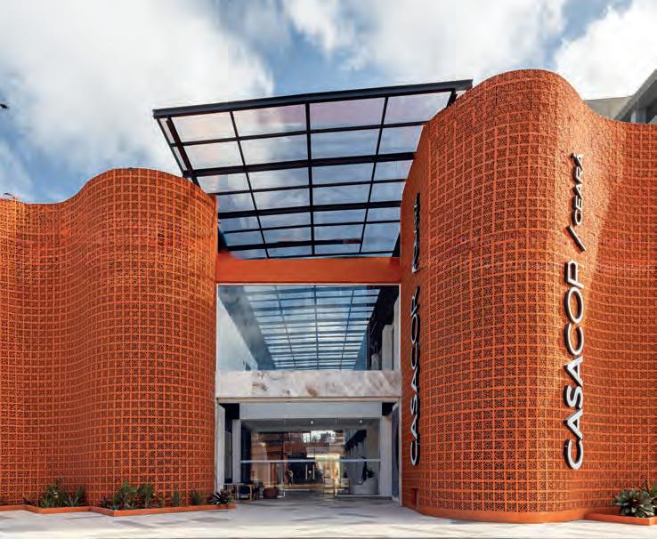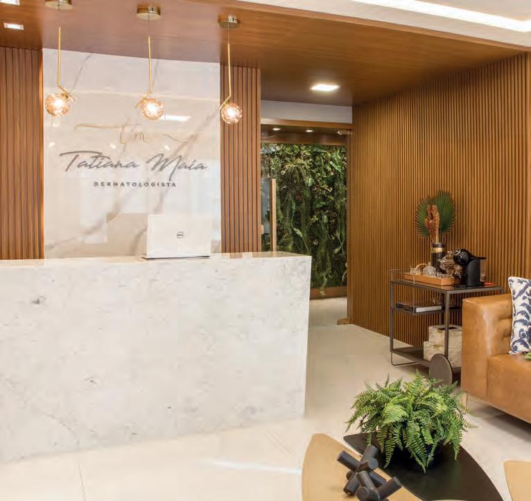 Ideias do projeto. Este projeto de reforma, elaborado pelas arquitetas Ana Míriam e Janice Diógenes, aborda uma transformação complexa de um edifício de dois pavimentos em uma clínica de saúde e imagem. Os principais desafios foram garantir acessibilidade e segurança, além de ressaltar o novo uso do prédio no entorno através de uma fachada marcante, combinando revestimento tipo granilha, grandes vãos em vidro reflecta bronze e uma extensa marquise em ACM de tom vibrante que, além de valorizar à logo da empresa, cria uma identidade visual moderna. Essa estrutura em balanço e linhas retas não só moderniza a edificação, como também destaca o prédio em meio a paisagem urbana pela estética contemporânea. Nos interiores, a escolha foi por materiais duráveis, como mármore paginado e acabamentos em madeira, que equilibram, ao mesmo tempo, elegância com aconchego, funcionalidade com fácil manutenção, sendo ideais para um ambiente de saúde. Detalhes marcantes. O uso do mármore paginado no balcão da recepção se destaca pelo efeito arte, além de transmitir uma atmosfera clean e refinada ao espaço.