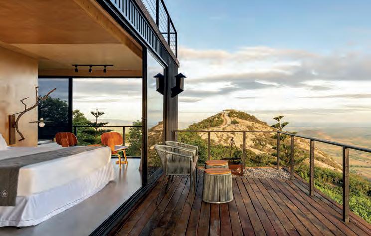Ideias do projeto. O projeto do Skye Lodge combina a simplicidade elegante do estilo escandinavo com a beleza natural da serra do Monte das Gameleiras, criando um refúgio perfeito para relaxar. Inspirado pela viagem dos proprietários ao norte da Escócia, o conceito deste charmoso micro-hotel, concebido pelo escritório KOI Arquitetos, traz um conceito minimalista e funcional, composto por dois blocos em balanço que proporcionam uma interação harmoniosa entre o ambiente construído e a paisagem local. Essa disposição permite aos hóspedes desfrutarem de vistas panorâmicas enquanto se protegem das condições climáticas, como o vento excessivo. A essência minimalista prevalece também nos interiores, onde a paleta de cores neutras – branco, cinza e preto – e o uso de madeira clara estabelecem uma atmosfera acolhedora e tranquila. Cada lodge é projetado como um layout aberto integrado, permitindo todas as atividades em um único ambiente. Esta praticidade é reforçada pelo sistema de automação que incrementa a experiência do hotel. Detalhes marcantes. Um dos elementos de destaque é o revestimento metálico preto, que cria um contraste elegante com os grandes panos de vidro que emolduram a paisagem ao redor. A integração da natureza à arquitetura é fundamental para a identidade do projeto, e o deck de madeira reaproveitada reforça o compromisso com a sustentabilidade, que vai desde o uso de fonte de energia limpa até a construção com baixa emissão de carbono.