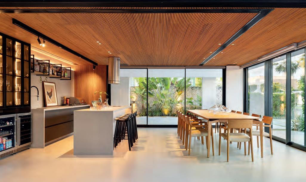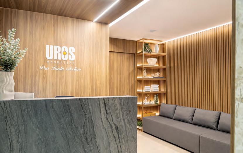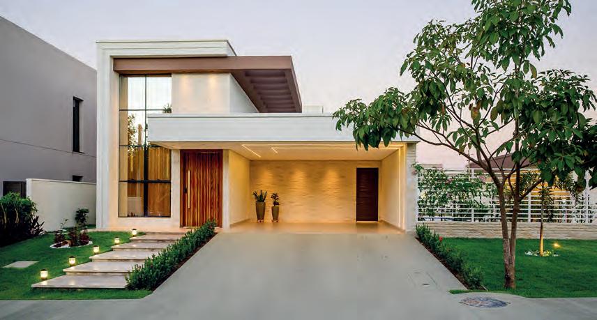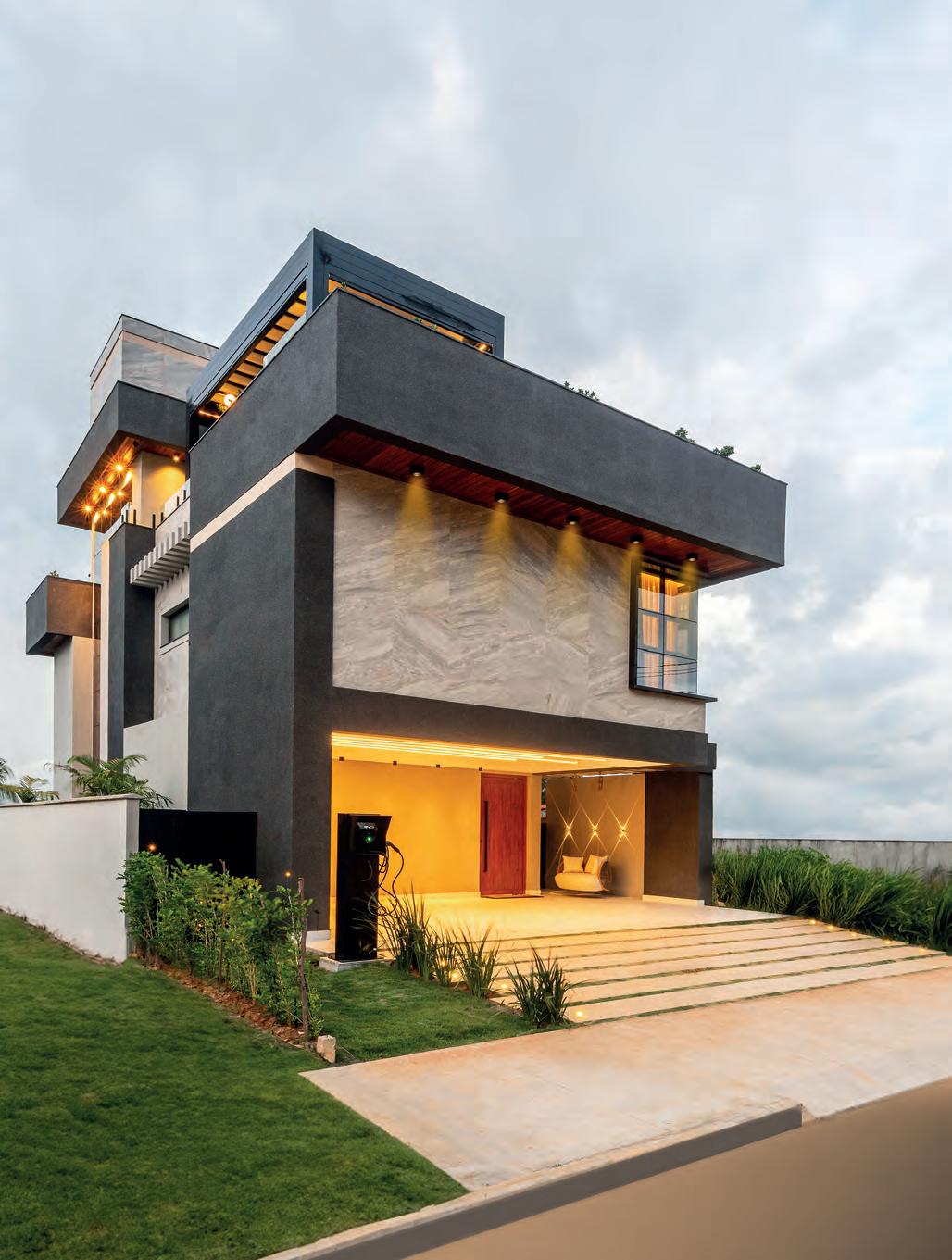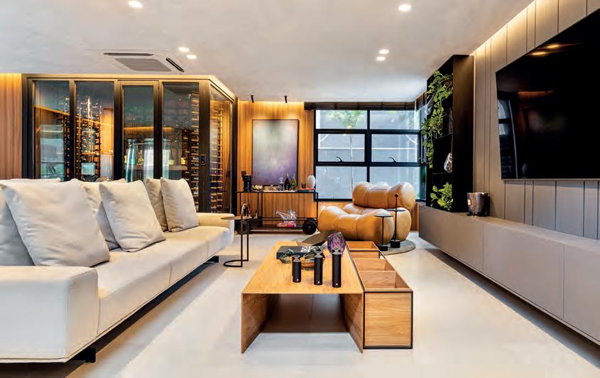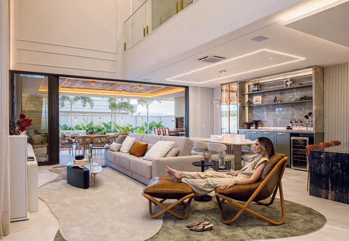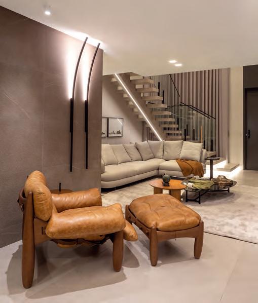 Com arquitetura contemporânea e volumetria imponente, o projeto assinado pelo arquiteto Luiz Alberto, valoriza o pé-direito duplo, a integração dos ambientes e a orientação voltada para o nascente, garantindo iluminação natural suave e ventilação cruzada. A fachada se destaca pelo contraste entre planos envidraçados, o revestimento em pedra escura e as linhas horizontais, que conferem leveza e equilíbrio à composição. As áreas gourmet, generosas e acolhedoras, tornam-se um convite à convivência, reforçadas pelo apuro estético do mobiliário, que une conforto e sofisticação. Os ambientes internos são marcados pelos revestimentos em madeira natural aplicados no teto e em painéis verticais, que aquece a composição e contrastam com a neutralidade dos tons claros do piso e das paredes, harmonizando-se com a escada escultural em pedra escura. Acompanhada por guarda-corpo em vidro, ela se impõe como elemento de destaque, equilibrando força e leveza. O mobiliário, de desenho elegante e funcional, alia formas orgânicas e traços retos, como a mesa de centro sinuosa em madeira e as poltronas de estrutura aparente, enquanto o lustre pendente de desenho linear e geométrico valoriza a altura do espaço e cria um ponto focal de identidade do projeto. Detalhes marcantes. A garagem foi planejada para atender às necessidades de um verdadeiro colecionador de automóveis, conectada a um charmoso bar de apoio. A acessibilidade é garantida pela inserção de um elevador, interligando de forma prática e inclusiva todos os pavimentos.