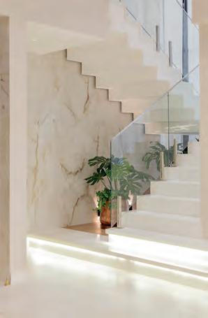 A residência, elaborada pelo escritório INMENSE Arquitetura, reflete uma estética contemporânea e atemporal, marcada por linhas retas, volumetria bem definida e a combinação equilibrada de materiais nobres e naturais. A fachada ganha imponência com o volume em balanço que abriga a varanda superior, ao mesmo tempo em que transmite leveza e proteção, enquanto a iluminação em LED define os planos e cria profundidade. O contraste entre a leveza do branco, a pedra natural, o porcelanato marmorizado e painéis de madeira ripada confere sofisticação e acolhimento, equilibrado pelo paisagismo tropical, que introduz o frescor e suaviza o rigor geomérico da edificação. Os ambientes internos seguem a mesma linguagem elegante e funcional, com paleta neutra, mobiliário leve e iluminação cênica, resultando em uma composição que inspira conforto, refinamento e bem-estar. Detalhes marcantes. Por estar voltada para o poente, a residência adota soluções inteligentes de sombreamento, como marquise ampla, paredes cegas, painéis ripados, vegetação densa e materiais claros, assegurando desempenho climático sem perder elegância. No interior, a escada escultural se transforma em protagonista, iluminada naturalmente pelo grande pano de vidro e acompanhada por um jardim que integra arquitetura e natureza.