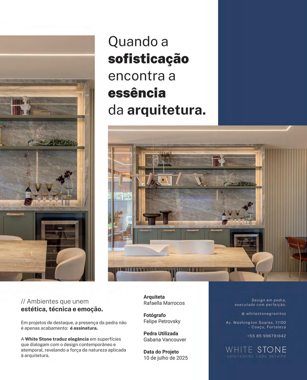 Entre luz, forma e matéria, a arquitetura cearense revela sua essência: projetos que unem leveza e sofisticação, integração com a natureza e um olhar contemporâneo sobre o morar. Nesta edição, cada obra apresenta um diálogo entre técnica e sensibilidade, onde o espaço se transforma em experiência e a estética encontra propósito.