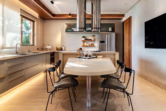 A casa combina imponência e leveza, com fachada marcada por volumes, revestimentos em pedra natural e iluminação estratégica que valoriza tanto os ambientes internos quanto a área externa. Assinado pelas arquitetas Sara Aragão e Ilana Rocha, do escritório Aupi Arquitetura, o projeto valoriza a integração linear entre sala, cozinha e varanda, resultando em um espaço contínuo que equilibra fluidez e delimitação. Essa estratégia amplia as possibilidades de convivência e transforma os ambientes em cenários versáteis para diferentes formas de uso e interação. No interior, a paleta neutra, em tons de bege e off-white, se combina a painéis madeirados e boiseries, conferindo sofisticação e aconchego. Durante o desenvolvimento do projeto, a aquisição de um lote adicional possibilitou a ampliação da casa, incluindo piscina, deck e área de cultivo orgânico. Tudo harmonizado em uma linguagem contemporânea e atemporal. Detalhes marcantes. O pé-direito duplo confere amplitude, enquanto elementos volumétricos como marquises e pergolados dão movimento à fachada. A cozinha, dividida por um pórtico iluminado, inclui ilha central em Supernano, vidro Reflecta e espelhos bronze, unindo funcionalidade e requinte.