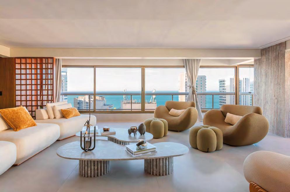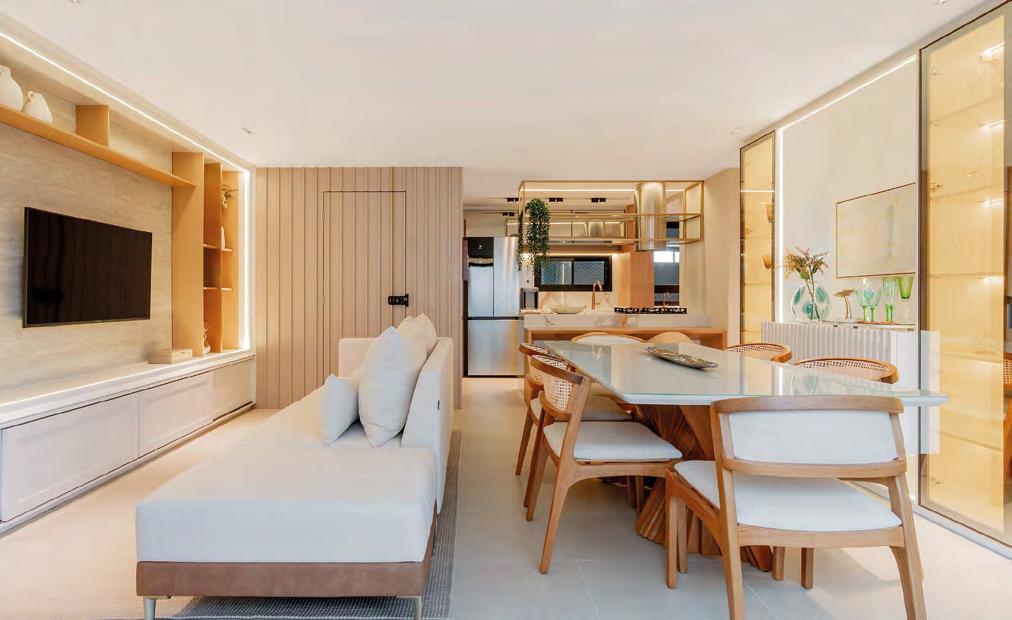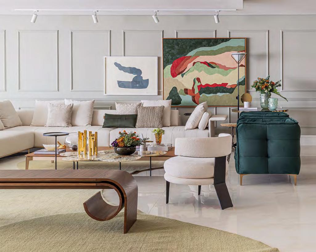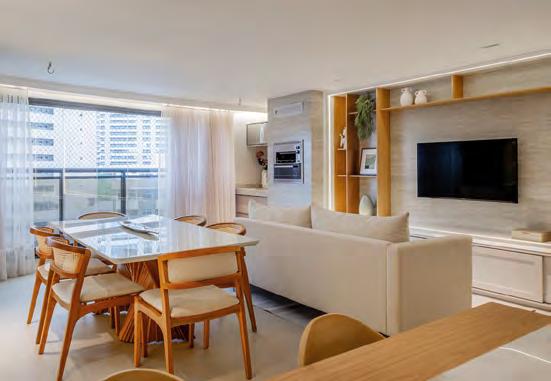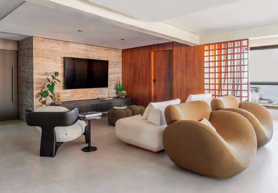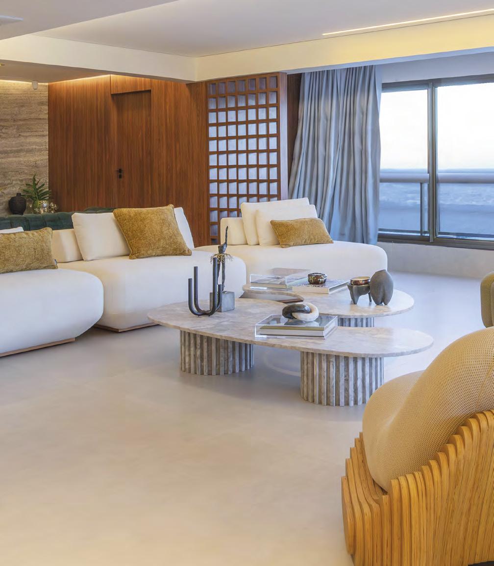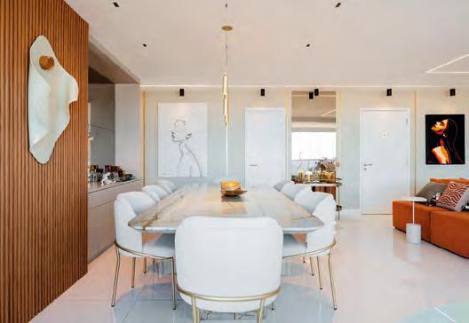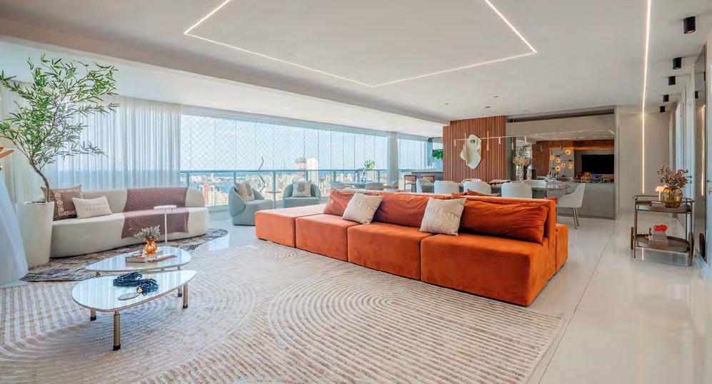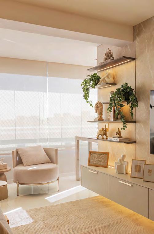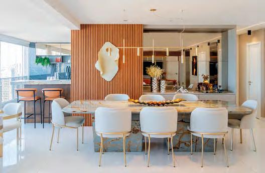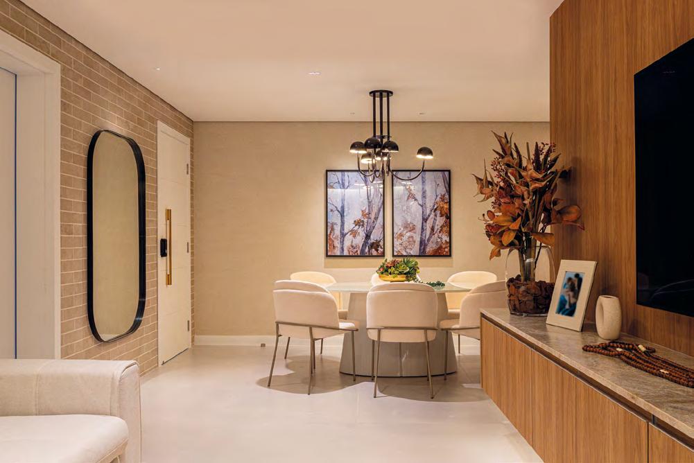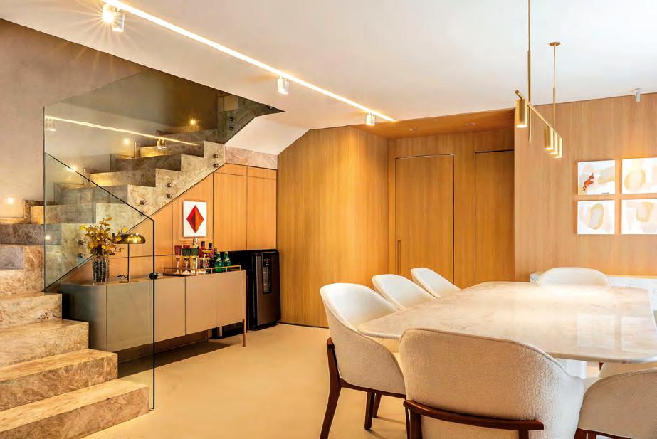 94- EM FOCO. Com atmosfera elegante e sensorial, o projeto de Denise Bringel une luz natural, integração e materiais sofisticados a uma curadoria de arte e design brasileiro, compondo uma residência pensada para o conforto e o bem-estar no cotidiano.