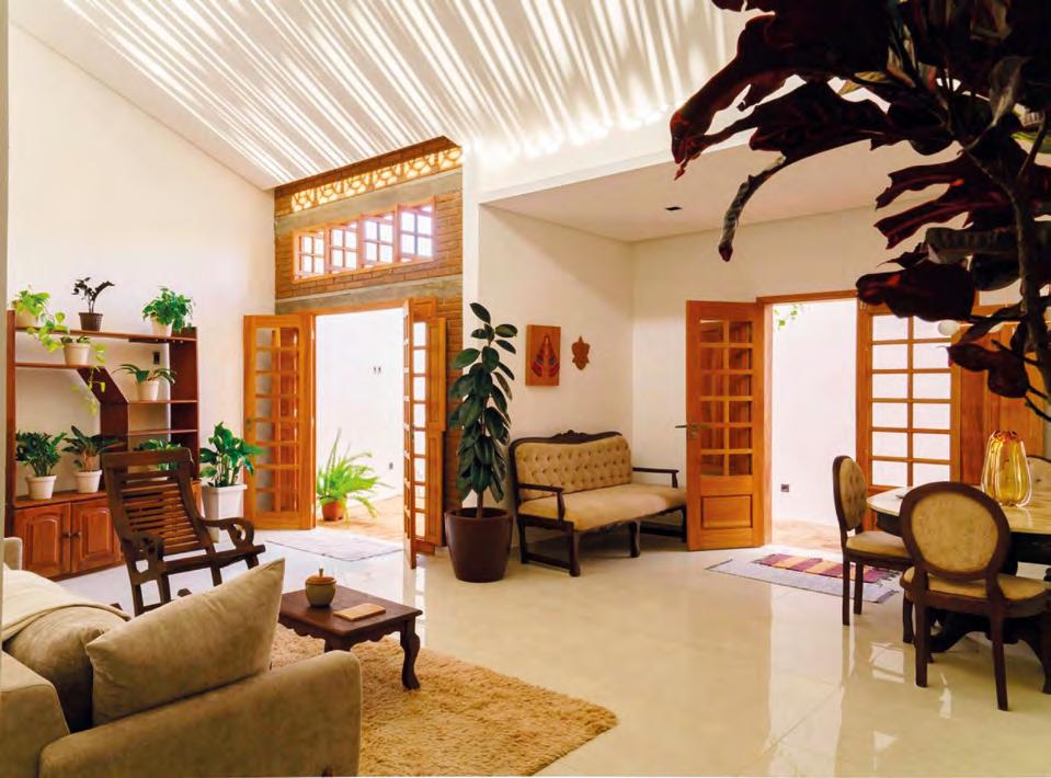 princípios construtivos adaptados ao clima nordestino, o arquiteto privilegia materiais naturais, ventilação cruzada, iluminação natural e soluções de baixo custo. A intervenção na fachada e nas áreas sociais ganha força ao transformar a restrição financeira em uma rica linguagem arquitetônica. A preservação das paredes originais em terra, a cobertura em duas águas desniveladas com exaustão por cobogós, a criação de um jardim interno e a incorporação de elementos vernaculares reinterpretados revelam uma obra que encontra, na inteligência do essencial, um propósito maior. Mais do que uma reforma, trata-se de um gesto de reconciliação entre arquitetura e cultura local, entre permanência e dignidade. Não por acaso, a “Casa de Mainha” alcançou reconhecimento internacional ao vencer o ArchDaily Building of the Year 2026 , na categoria Houses
