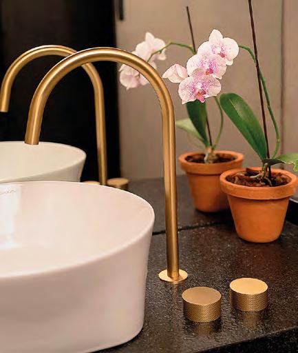Assinado para a Roca pelo premiado Benedito Design Studio, de Ramon Benedito e Maite Prat, o monocomando da coleção Teras alia uma estética minimalista a recursos de eficiência, como arejador oculto, que amplia o conforto e contribui para a economia de água, e o sistema Cold Start, que reduz o consumo de energia ao evitar o acionamento imediato do aquecedor. A linha está disponível nos acabamentos Brushed Gold, Matte Black, Aço Escovado e Cromado. Na imagem ao lado, a linha Domus, da Lexxa, aposta em soluções funcionais e personalizáveis, com registros que permitem abrir, fechar e regular o fluxo de água com precisão, combinando uso intuitivo, design atual e acabamentos sofisticados.