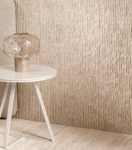 REALIDADE AUMENTADA. A indústria deixou de buscar uma superfície apenas bonita e passou a investir em relevo integrado, desenho menos repetitivo e textura perceptível. Esse movimento aparece de forma muito clara na Biancogres, que apresentou na coleção Sentir produtos como Piasentina Grey e Travertino Reale Greige com acabamento Strutturato, no qual o relevo se encaixa ao desenho para aumentar o realismo e a profundidade da superfície.