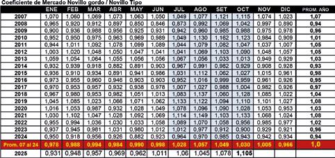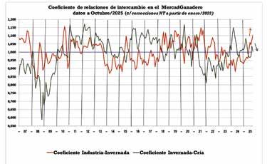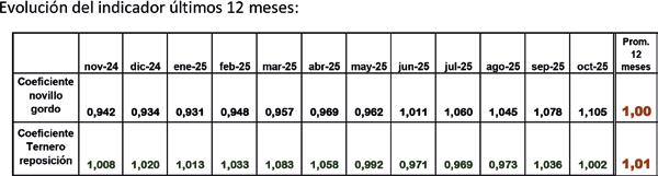 En el mes de OCTUBRE de 2025 el coeficiente de relación de mercado para el novillo gordo (1,105) se ubicó 7,5 puntos por encima del promedio del mismo mes en los 18 años anteriores (1,030). En ambos casos situación favorable al invernador.