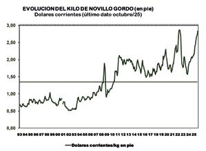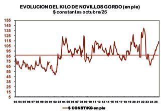 En la serie analizada el novillo gordo cotizó 102% por encima del promedio de la media en dólares corrientes, en tanto que en moneda nacional constante a oct/25 cotizó 26% por encima de la media para el mismo periodo.