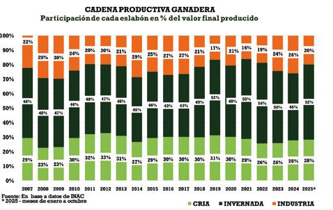 En los meses de enero a octubre del 2025, en comparación con el año anterior, la invernada aumento 6 puntos su participación en el valor final generado por la cadena, lo que fue perdido por la industria (-6) mientras la cría mantiene su cuota parte de participación (ver gráfico).
