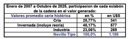 Serie histórica: En la formación del valor del novillo tipo, tomando la serie histórica a partir de enero de 2007 (226 meses analizados), la industria participó en el 23,06% de dicho valor, la invernada (recría y engorde) el 48,17% y la cría aportó el restante 28,77% (ver cuadro).
