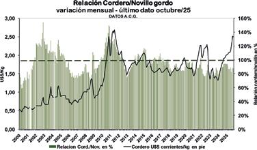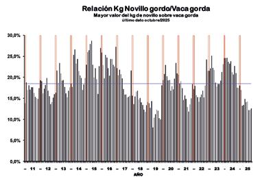 En octubre/25 el novillo gordo cotizó 12,6% por encima de la vaca gorda. Se mantiene baja relación entre ambos valores analizados en la serie considerada. La media histórica para el período ene/2011 a la fecha sitúa al novillo gordo 18,5% por encima de la vaca gorda.