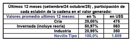 En valor absoluto, la cotización promedio del Novillo Tipo en los últimos 12 meses (U$S 1.689) fue 42% mayor al promedio de la serie histórica (226 meses). Este mayor valor absoluto se redistribuye en forma diferencial entre los eslabones de la cadena. Respecto de la media histórica de la serie analizada, la cría aumentó 39,2% el valor del producto ternero (U$S 475), la invernada incrementó 49,6% el valor del novillo gordo (U$S 863), finalmente la industria aumentó 3,1% su participación a través del valor agregado industrial (U$S 350).