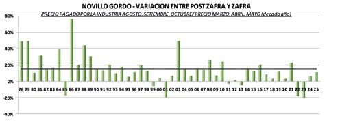 En la serie ENERO/2007 a OCTUBRE/2025 el novillo gordo significó en valor promedio el 77% del valor del novillo tipo. En los últimos 12 meses esta relación aumentó al 79,3%.