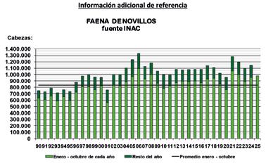 La faena de novillos en octubre de 2025 se aumentó 4,2% respecto setiembre. En el acumulado de los primeros 10 meses del año fue 2,6% mayor al mismo período del 2024, 10% mayor al del 023 y 1,9% inferior al acumulado de los mismos meses del 2022.