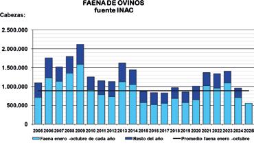 La faena total de ovinos en octubre/25 fue 97% superior al mes anterior, como ocurre a esta altura del año. En el acumulado anual y respecto a similar período de años anteriores, se faenaron 21,7% menos que en el 2024, 50% menos que en el 2023 y 42,5% menos que en el 2022. En los 10 meses transcurridos la faena fue 37% inferior al promedio de similar periodo para el total de la serie analizada (barra celeste en el gráfico).