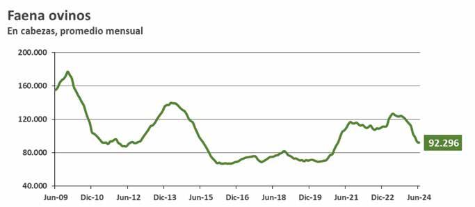 La faena total de ovinos en junio/24 fue 25,2% mayor respecto del mes anterior, en el acumulado anual se faenaron 42% menos ovinos que igual periodo del año anterior, 25,7% menos que en el 2022 y 27,2% inferior que en igual periodo del 2021.