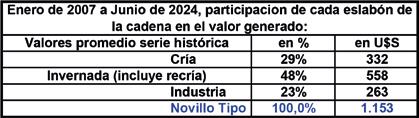 Serie Histórica: En la formación del valor del Novillo Tipo, tomando la serie histórica a partir de enero de 2007 (210 meses analizados), la industria participó en el 23% de dicho valor, la invernada (recría y engorde) el 48% y la cría aportó el restante 29% (ver cuadro).