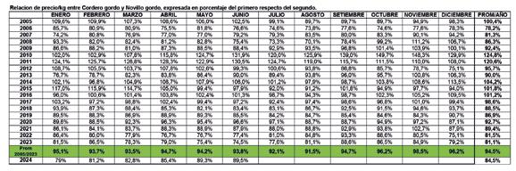 La relación de precio entre valor del cordero gordo y novillo gordo para la serie histórica analizada está altamente influenciada por el efecto año. Resulta aventurado establecer un vínculo entre la época del año y la relación de precios entre ambos productos. No obstante, en el cuadro se pueden comparar los meses del año en curso con el promedio de los 19 años anteriores.