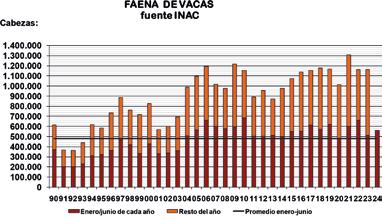 La faena de vacas y vaquillonas en junio de 2024 fue 11% inferior al mes anterior. En el acumulado anual se incrementó 9% respecto del mismo período del año anterior, 10,2% inferior a igual periodo del 2022 y 4,4% menor al 2021.