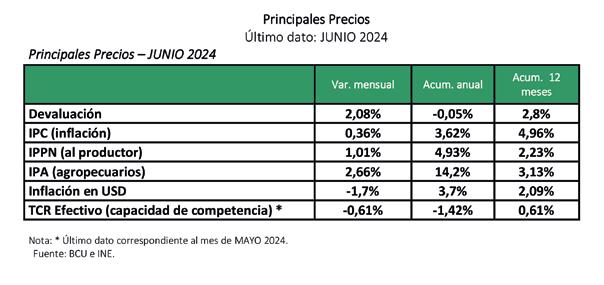 En JUNIO/24 el valor del Novillo Tipo (U$S 1.488/cabeza) se redujo 2,8% respecto al mes anterior. Por su parte el valor del Novillo Gordo informado por INAC (U$S 1.082/cabeza), aumentó 1,5% respecto a mayo. En consecuencia, el valor agregado industrial (U$S 406/cabeza) se redujo 12,3% respecto del mes anterior (en mayo el VAI alcanzó el valor más alto en la serie de 17 años y 6 meses). El valor del kg de ternero de reposición (informado por ACG) se redujo 1,8 % en relación al valor de mayo, primera baja luego de 3 subas consecutivas.