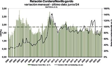 Con significativas variantes estacionales a lo largo del año, desde que se trata de un producto con mercado zafral, en junio/24 el cordero gordo de 35 kgs se mantuvo en la misma relación de valores con el novillo gordo respecto al mes anterior, cotizando 89% del precio de de este último.