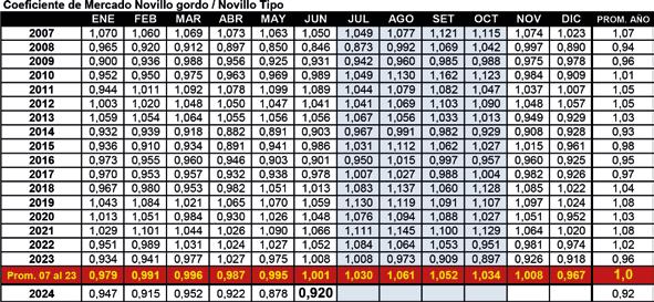 Se parte de la premisa que el productor es tomador de precio. El Novillo Tipo es la variable determinante del valor del novillo vendido por el productor, esta última la variable dependiente. Dado que existe una alta correlación entre ambas variables, se puede establecer la ecuación que estima a partir del Novillo Tipo un valor para el Novillo gordo a partir de la relación histórica en la serie. Similar razonamiento para la relación novillo gordo – ternero de reposición. La construcción del coeficiente de relaciones de mercado surge de comparar los valores efectivamente pagados en el mercado con aquel estimado a partir de la ecuación que interpreta matemáticamente las relaciones de intercambio en toda la serie analizada. Cuando el coeficiente de mercado es igual a 1 el valor efectivamente pagado al productor se corresponde con el valor estimado a partir de las relaciones históricas del mercado (para cada uno de los casos: mercado con destino a industria e intra ganadero o de reposición). Cuando el coeficiente es superior a 1 indica que el mercado está pagando por encima de lo estimado en función de las relaciones históricas, relación favorable al vendedor. Cuando está por debajo de 1 indica lo contrario, el valor real es menor al que surge de las relaciones históricas, relación favorable al comprador. Es necesario advertir al lector que el coeficiente debe ser tomado con las limitaciones del análisis, no adjudicándole otro valor que una mera referencia a las relaciones históricas en el vínculo indus-