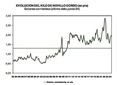 En la serie enero/2007 a junio/2024 (210 meses) el valor del novillo gordo cotizó en promedio el 77,2% del valor del novillo tipo. Esta diferencia relativa aumentó en los últimos 12 meses (julio/23 – junio/24) cotizando el novillo gordo el 73,3% del novillo tipo. En la misma serie histórica de 210 meses, el ternero de reposición de 160 kgs cotizó en promedio 37,2 % del valor del novillo gordo. En los últimos 12 meses (julio/23 – junio/24) esta relación se mantuvo incambiada. La relación de reposición (Kg flaco/kg gordo) promedio de los los 210 meses analizados fue 1,12. Esta relación se mantuvo incambiada en los últimos 12 meses.