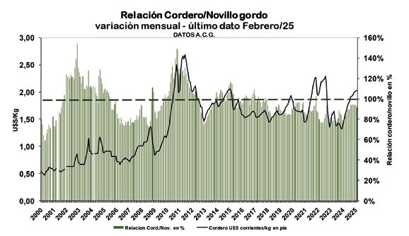 Con significativas variantes estacionales a lo largo del año, desde que se trata de un producto con mercado zafral, en FEBRERO/25 el cordero gordo de 35 kgs cotizó 92% del valor del novillo gordo.