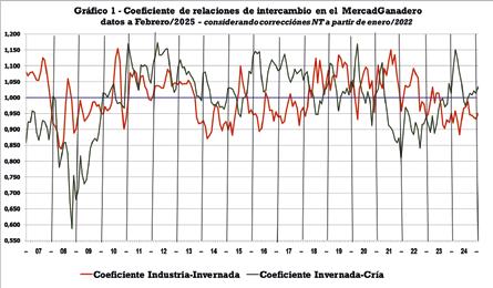La construcción del coeficiente de relaciones de mercado surge de comparar los valores efectivamente pagados en el mercado con aquel estimado a partir de la ecuación que interpreta matemáticamente las relaciones de intercambio en toda la serie analizada. Cuando el coeficiente de mercado es igual a 1 el valor efectivamente pagado al productor se corresponde con el valor estimado a partir de las relaciones históricas del mercado (para cada uno de los casos: mercado con destino a industria e intra ganadero o de reposición). Cuando el coeficiente es superior a 1 indica que el mercado está pagando por encima de lo estimado en función de las relaciones históricas, relación favorable al vendedor. Cuando está por debajo de 1 indica lo contrario, el valor real es menor al que surge de las relaciones históricas, relación favorable al comprador. Es necesario advertir al lector que el coeficiente debe ser tomado con las limitaciones del análisis, no adjudicándole otro valor que una mera referencia a las relaciones histó-