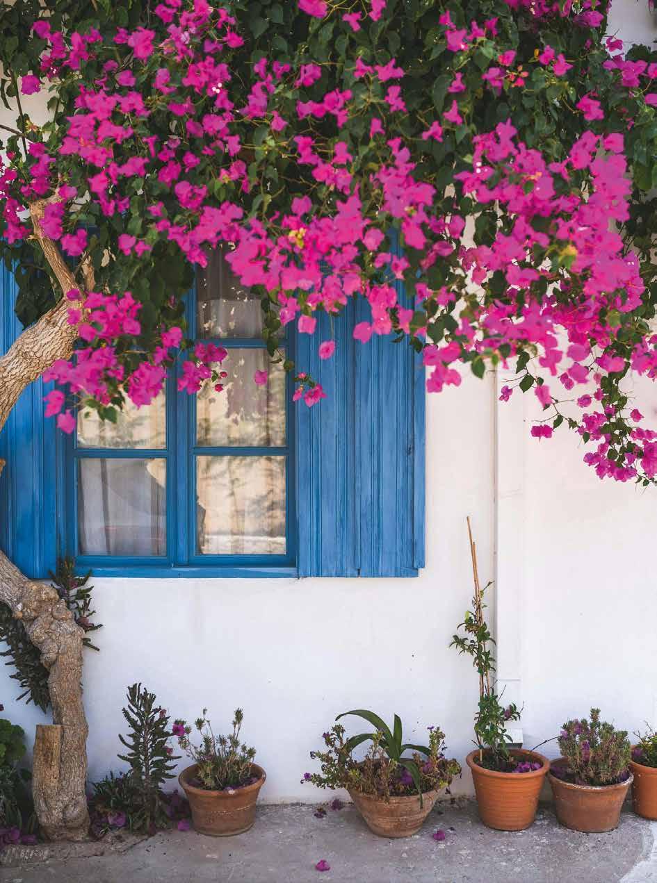Otra gran aliada es la buganvilla, ideal para climas cálidos y secos. Sus tonos intensos en fucsia, blanco, naranja o violeta, llenan de vida muros y pérgolas. Es una planta rústica, amante del sol y poco exigente en agua, perfecta para jardines costeros o casas de campo.