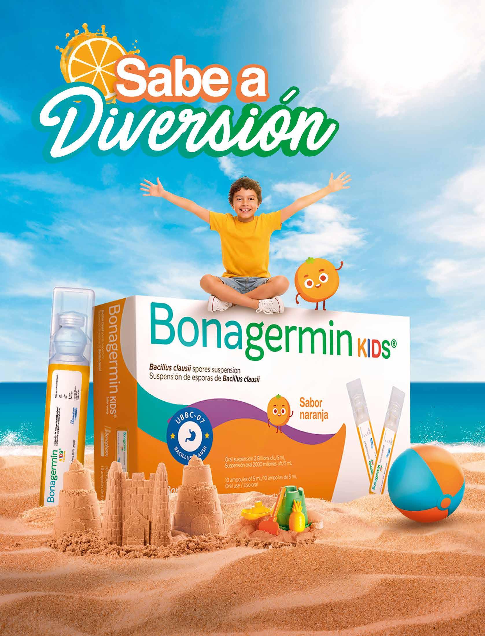 BONAGERMIN KIDS® 2000 millones UFC/5 mL Suspensión Oral Sabor Naranja R.S. N° DE-4826 (UNIQUE BIOTECH LIMITED) Composición: Cada ampolla de 5 mL contiene: Suspensión de esporas de Bacillus clausii (UBBC-07) 2000 millones ufc Excipientes: c.s.p. Uso Recomendado: Suplemento dietético: Probiótico. Dosis: Niños: 1-2 ampollas por día. Lactantes: 1-2 ampollas por día. Administrar a intervalos regulares (cada 3-4 horas), tomando el contenido de la ampolla como tal o diluyendo en agua u otra bebida (por ejemplo, leche, té o jugo de naranja). Contraindicaciones y Advertencias: Hipersensibilidad a cualquiera de los componentes del producto. Conservar a temperatura no mayor de 30°C. Manténgase fuera del alcance de los niños. Vía de administración: Oral. Venta sin receta médica. Agítese antes de usar. ADVERTENCIA: Suplemento dietético, no debe utilizarse como sustituto de una dieta equilibrada. No superar la dosis diaria recomendada para el suplemento dietético.