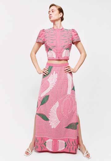 Este año, el colectivo presentó dos colecciones que marcaron un punto de madurez para la marca. La primera, Itia, se inspiró en la palabra “tiempo”. A través de textiles que reflejan distintos momentos de luz y oscuridad en la Amazonía, retoman figuras centrales del arte Kené: el jaguar, la anaconda, el colibrí, explorando cómo la naturaleza amazónica se convierte en símbolo, ritmo y memoria.