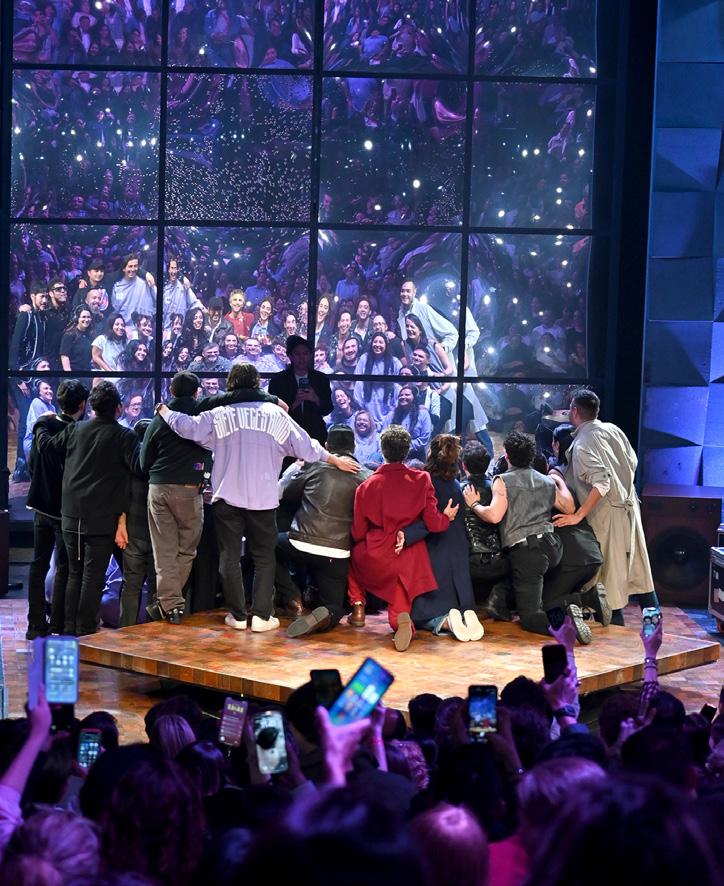 Uno de los momentos más destacados ocurrió cuando descendió del escenario para acercarse a los asistentes, generando una interacción directa con sus seguidores. Entre abrazos y manos extendidas, la escena reforzó la conexión que marcó toda la presentación.