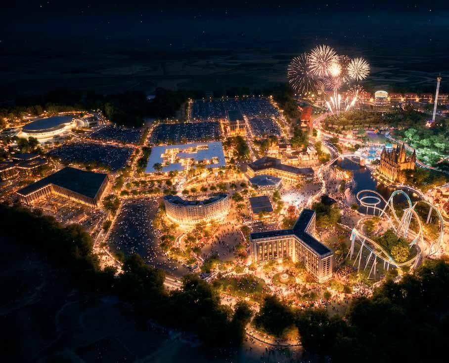 El complejo, además, nace con vocación de resort integral, no solo de parque de atracciones de día. El proyecto incluye tres hoteles, un parque acuático,