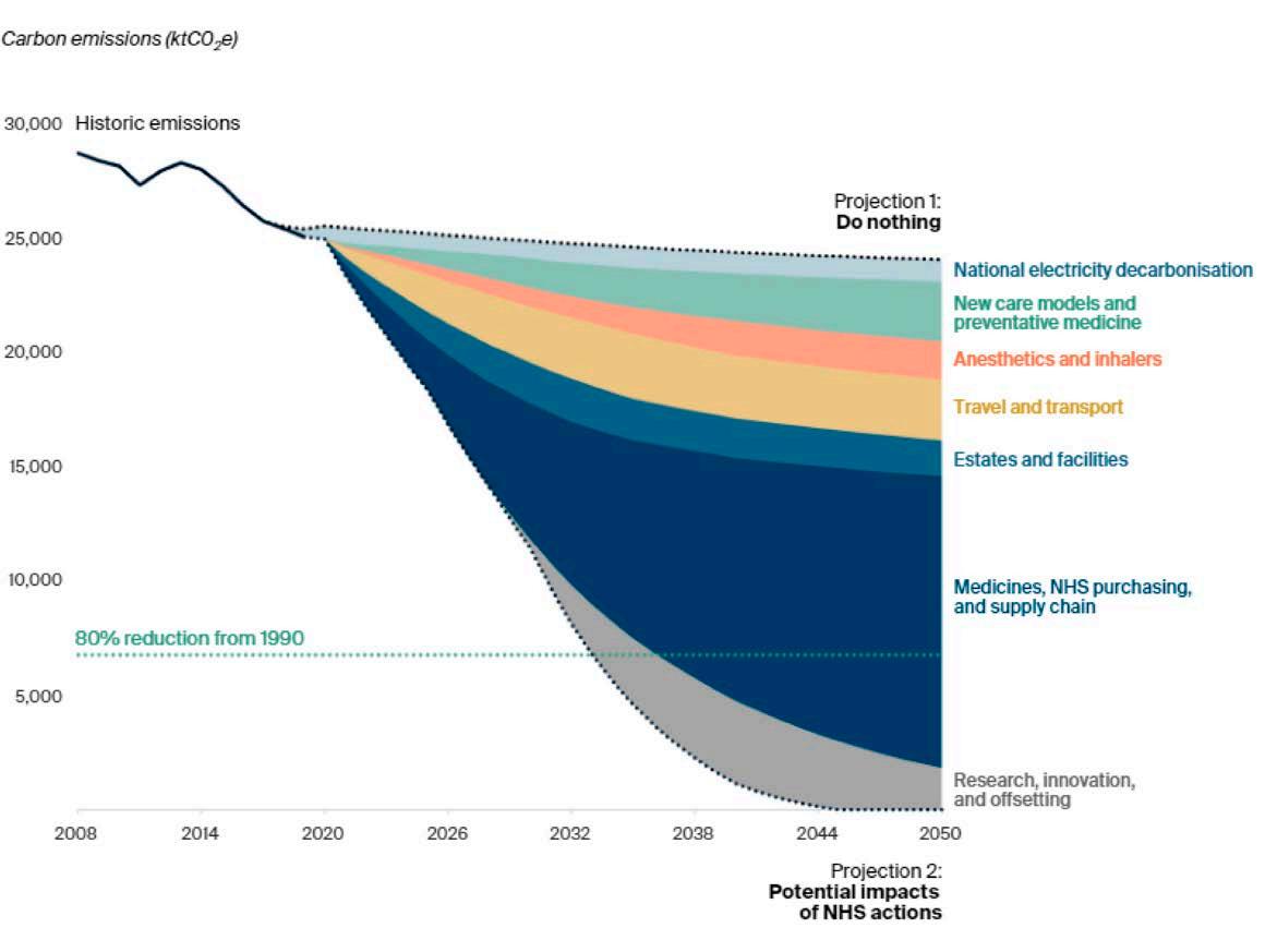 76 ACTUALIDAD Medidas para descarbonizar el sistema sanitario. El Servicio Nacional de Salud del Reino Unido (NHS) es el primer sistema sanitario del mundo que se ha comprometido a reducir a cero sus emisiones netas de carbono.