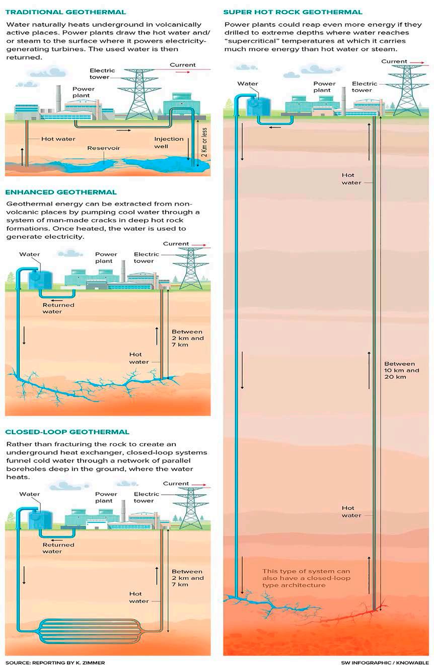 hacia pozos, de hasta varios kilómetros de profundidad, para abrir grietas en las rocas. La roca agrietada y el agua crean un radiador subterráneo donde el agua se calienta antes de subir a la superficie a través de un segundo pozo. Se han construido docenas de instalaciones de EGS de este tipo en Estados Unidos, Europa, Australia y Japón (la mayoría de ellas experimentales y financiadas por el gobierno) con éxito desigual.