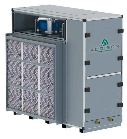 Solución de ventilación de diseño compacto. Se puede instalar en espacios reducidos. Para cualquier aplicación que requiera sistemas divididos para ventilación o deshumidificación. Versátil gama de opciones, desde fuente de aire de condensador remoto o funcionamiento enfriado por agua, lo convierten en la mejor opción para comercios minoristas, oficinas, hotelería, etc. Capacidad de 1045 toneladas. Operación opcional de bomba de calor de fuente de agua. Flujo de 1500 a 7000 CFM de aire exterior. Bobinas de aire entrelazadas de 6 filas. Circuito de recalentamiento modulante. Circuito de subenfriamiento conmutable. Compresores Scroll (VFD opcional). Controles digitales con integración BAS. Sopladores de suministro de cámara plenum EC de accionamiento directo. Gabinete de aluminio y acero galvanizado. Múltiples puntos de acceso a servicios. Operación exclusiva de deshumidificación con aire exterior o recirculación. Puertas de acceso de doble pared abatibles y desmontables. Aislamiento de espuma de doble pared de 2” (R13). Protección contra la corrosión opcional de 10.000 horas. www.addison-hvac.com