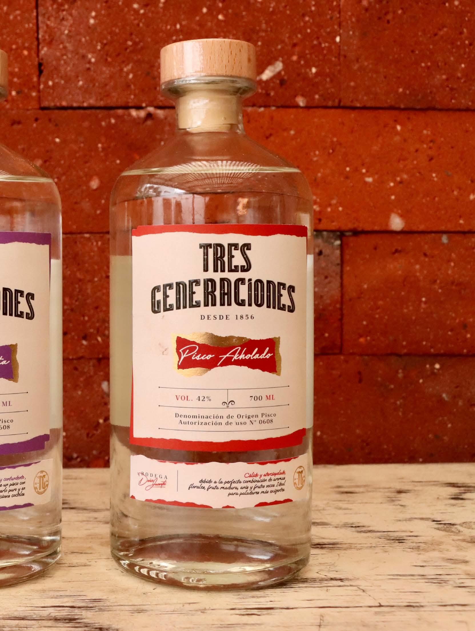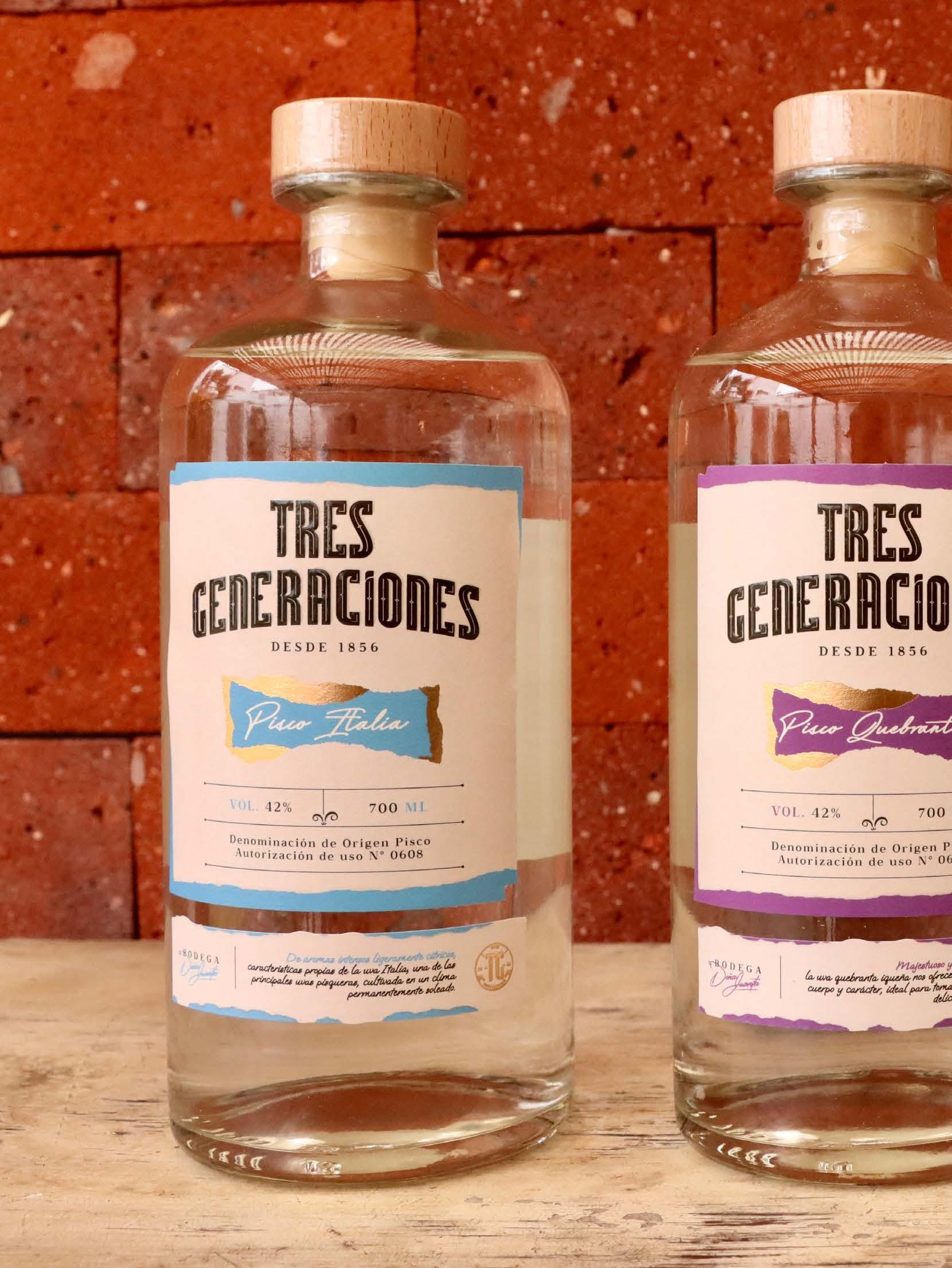 Tres Generaciones inició elaborando piscos y vinos dulces (mistelas). Producen Pisco Mosto verde Quebranta, Torontel y Acholado, y los puros Italia, Torontel, Quebranta, y Albilla. Como familia consideramos que el futuro de nuestro destilado de bandera está fuera del Perú. «Ac-