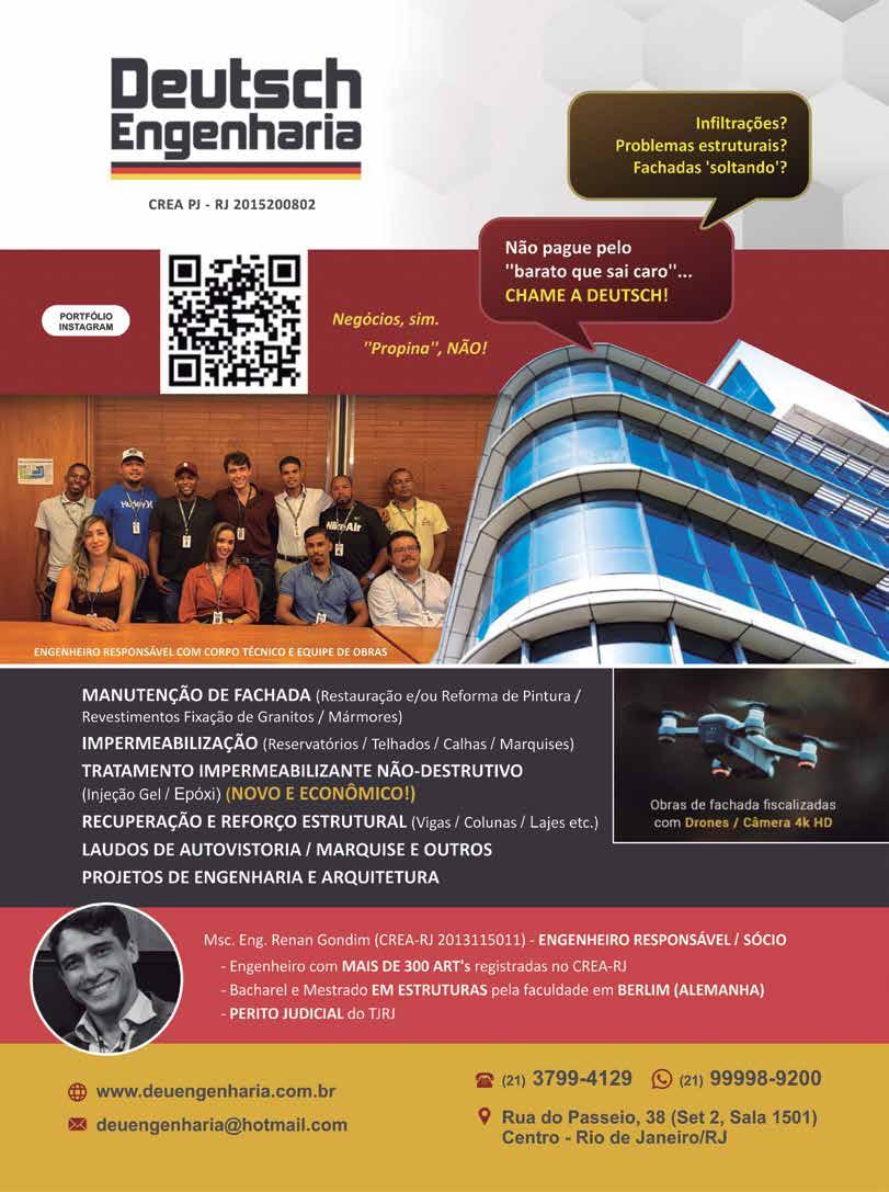 conta que, há alguns anos, a empresa foi contratada para reconstruir a varanda do prédio de um condomínio na zona oeste do Rio. “Uma parte da varanda caiu, desabou mesmo, e a outra ficou pendurada. Nós reconstruímos a varanda e usamos reforço de fibra de carbono; aproveitamos e reforçamos todas as varandas do prédio. O incidente aconteceu por falta de manutenção e, por sorte, não houve vítimas.”