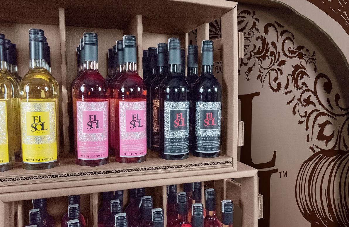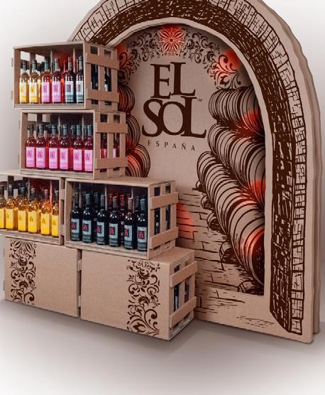 Esta estructura de cartón corrugado en tonos grises refleja la autenticidad de una bodega subterránea, con detalles que evocan barricas de roble y cajas de vino que resguardan el espíritu del sol español.